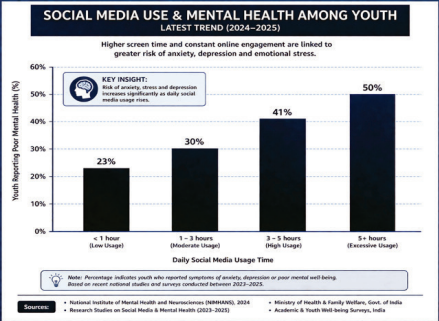 Social media is now a big part of everyday life. In India, over 67% of people use at least one social media platform, with young people making up the largest group. Young users today spend 2 to 5 hours online each day, often starting just minutes after waking up.
