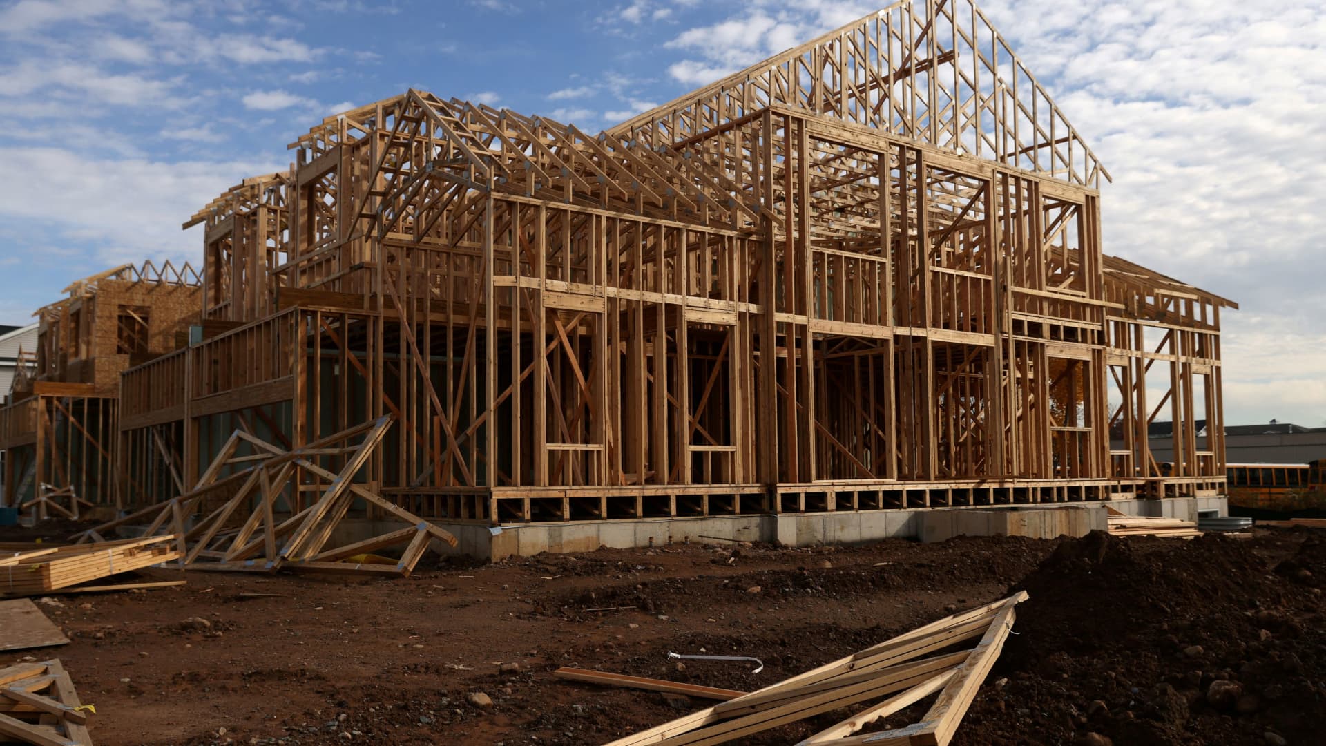 The structural frame of a house is seen at The Collection at Morristown, a housing development by Lennar Corporation, in Morristown, New Jersey, November 13, 2021.