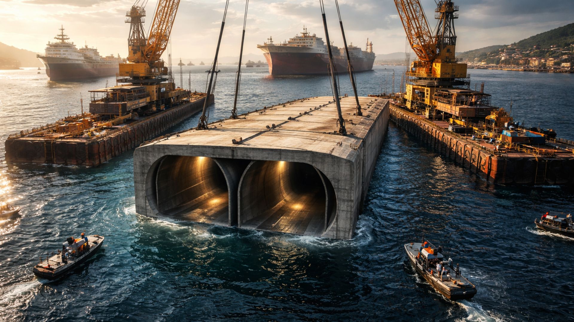 The chosen engineering is that of the immersed tunnel, a method in which concrete modules are produced outside the channel, transported by flotation, and then submerged over a trench prepared on the bed.